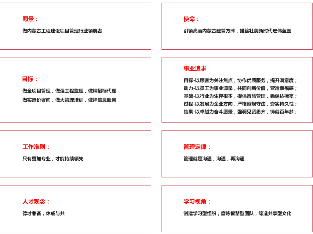 万和项目管理公司坚定不移地围绕“和文化”核心,以持续打造“万象更新”地创业面貌和“和衷共济”地发展理念为俩翼,提倡“员工、客户、行业、社会”四个方面融为一体,为员工搭建创业平台,为客户提供增值服务,与同行结生态盟友,对社会尽企业义务。
